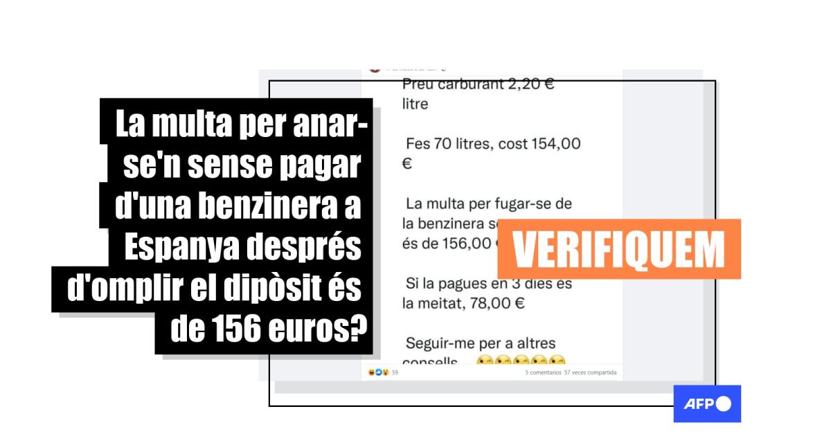 Les publicacions en català a Facebook (1, 2) fan un càlcul matemàtic, estimant el preu del carburant en 2,20 euros el litre. Per tant, omplir un dipòsit de 70 litres costaria 154 euros. “La multa per fugar-se de la benzinera sense pagar és de 156,00” euros, diuen les entrades, que afegeixen: “Si la pagues en 3 dies és la meitat, 78,00€”.