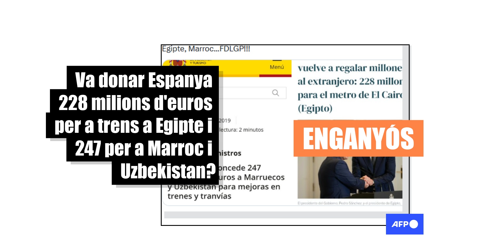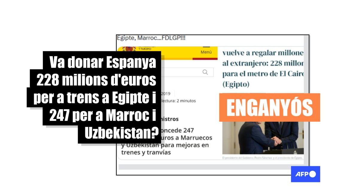 El missatge es comparteix juntament amb dues captures de pantalla. En una s’hi llegeix que “el Govern concedeix 247 milions d’euros al Marroc i a l’Uzbekistan per a millores en trens i tramvies”. “El Govern de Sánchez torna a regalar milions a l’estranger: 228 milions per al metro del Caire (Egipte)”, diu l’altra.