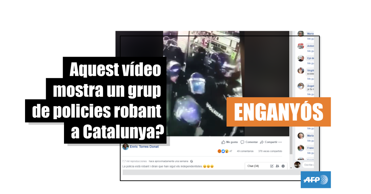 “La policia està robant i diran que han sigut els independentistes”, diu una publicació a Facebook el 22 d’octubre de 2019. El text va acompanyat d’un vídeo en el qual es veu un grup del que semblen policies amb equipament d’antiavalots que s’apropia d’objectes d’una botiga.