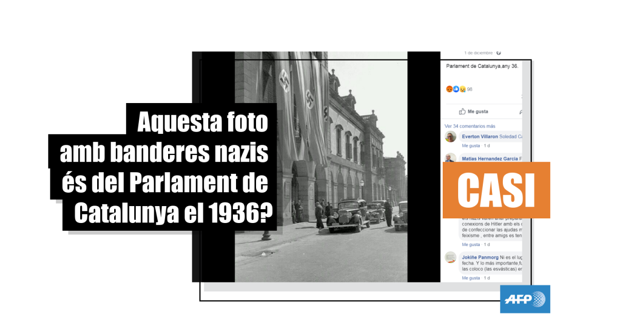“Parlament de Catalunya, any 36”, diu la llegenda d’una publicació a Facebook compartida desenes de vegades. El text acompanya una foto vertical en blanc i negre en la qual es veu un edifici amb arcs del qual pengen banderes verticals amb el símbol nazi. Davant hi ha cotxes aparcats. Alguns comentaris creuen el text de la llegenda, i diuen coses com “La estupidez humana no tiene límites”. D’altres, però, dubten sobre la veracitat de la imatge, per exemple: “Ni és el lloc. Ni es la data. I lo més important, va ser Franco qui les va col·locar (les esvàstiques) a tota Espanya”.