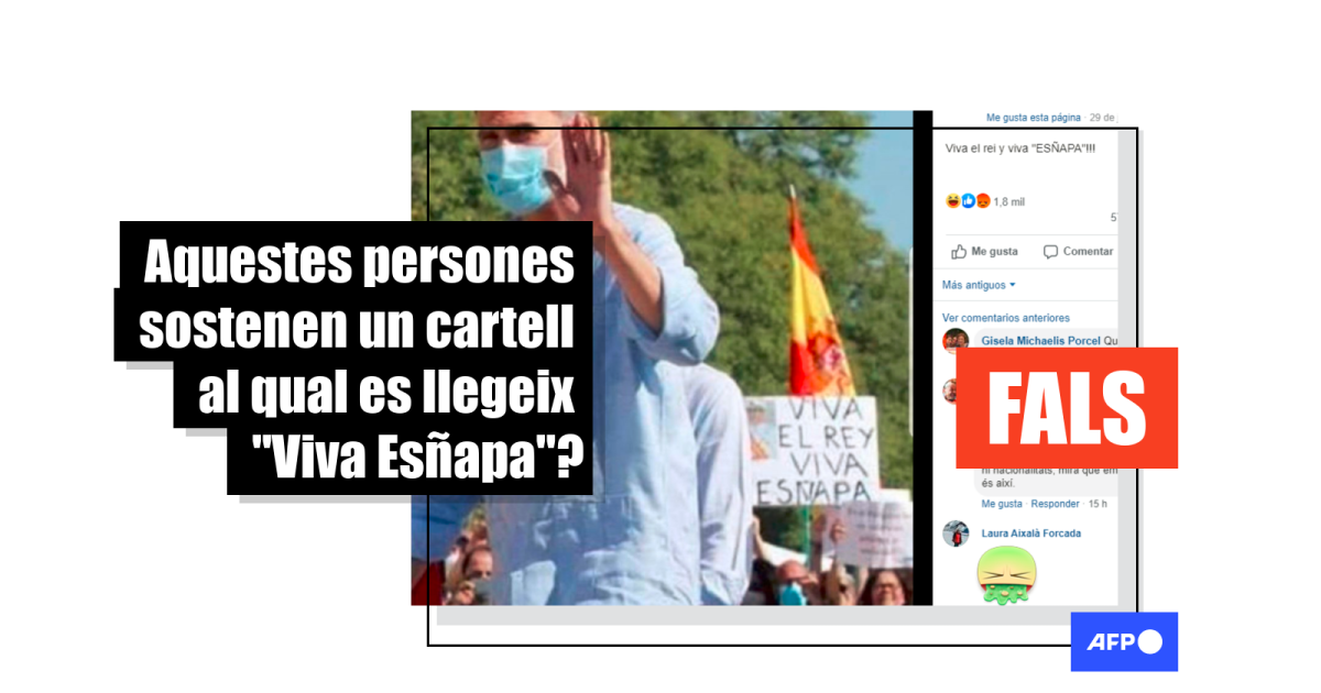 “Viva el rei y viva "ESÑAPA"!!! [sic]”, diu la llegenda d’una publicació a Facebook, que comparteix una imatge del monarca Felip VI a Sevilla el passat 29 de juny, amb un grup de gent entre la qual es veu la suposada pancarta mal escrita.